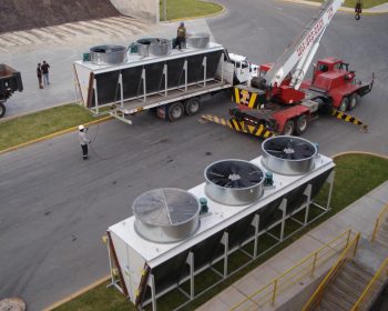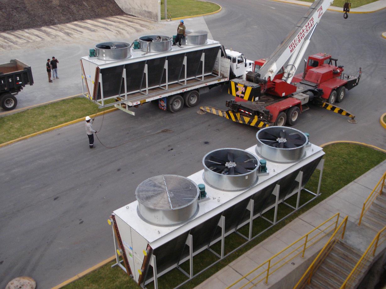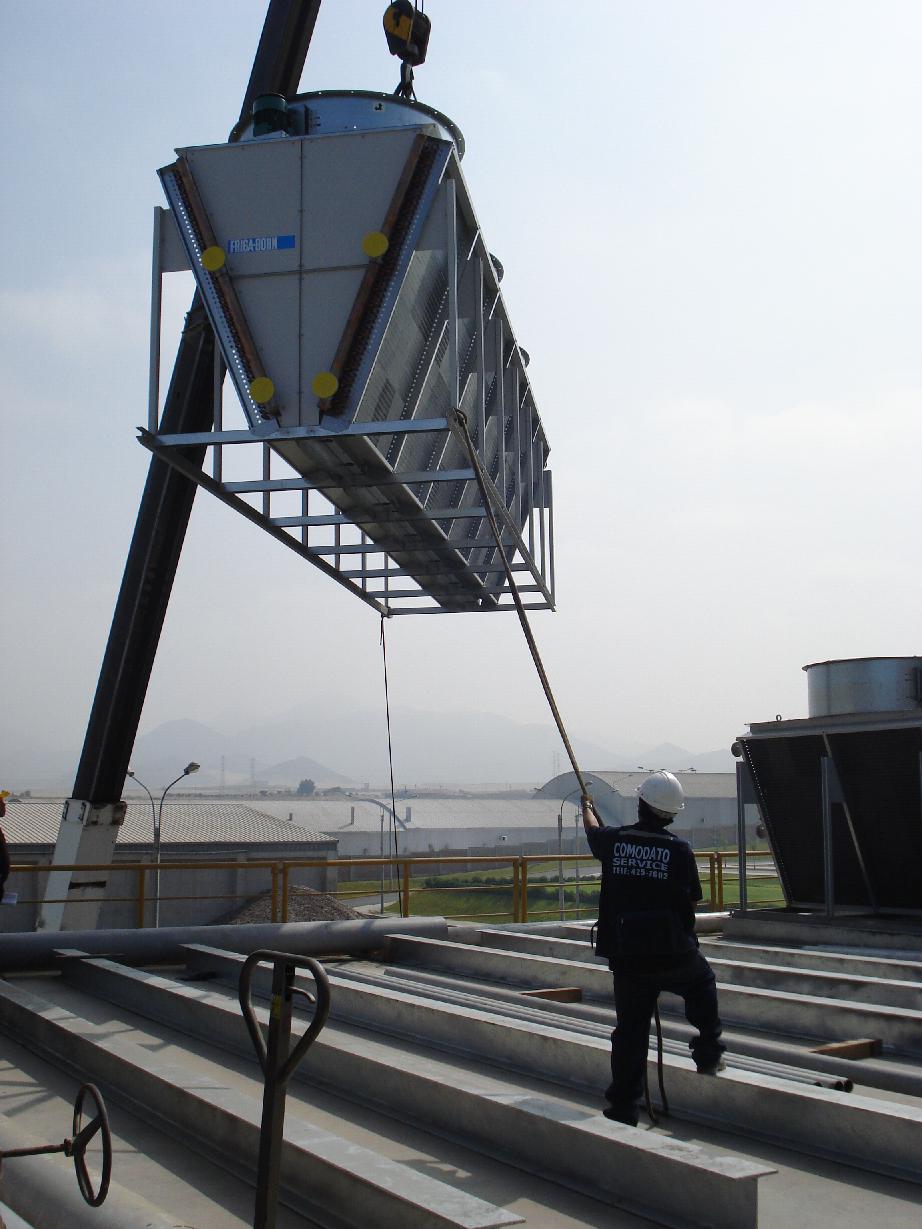 Torre de enfriamiento en posición para ser izada en su lugar de montaje.
